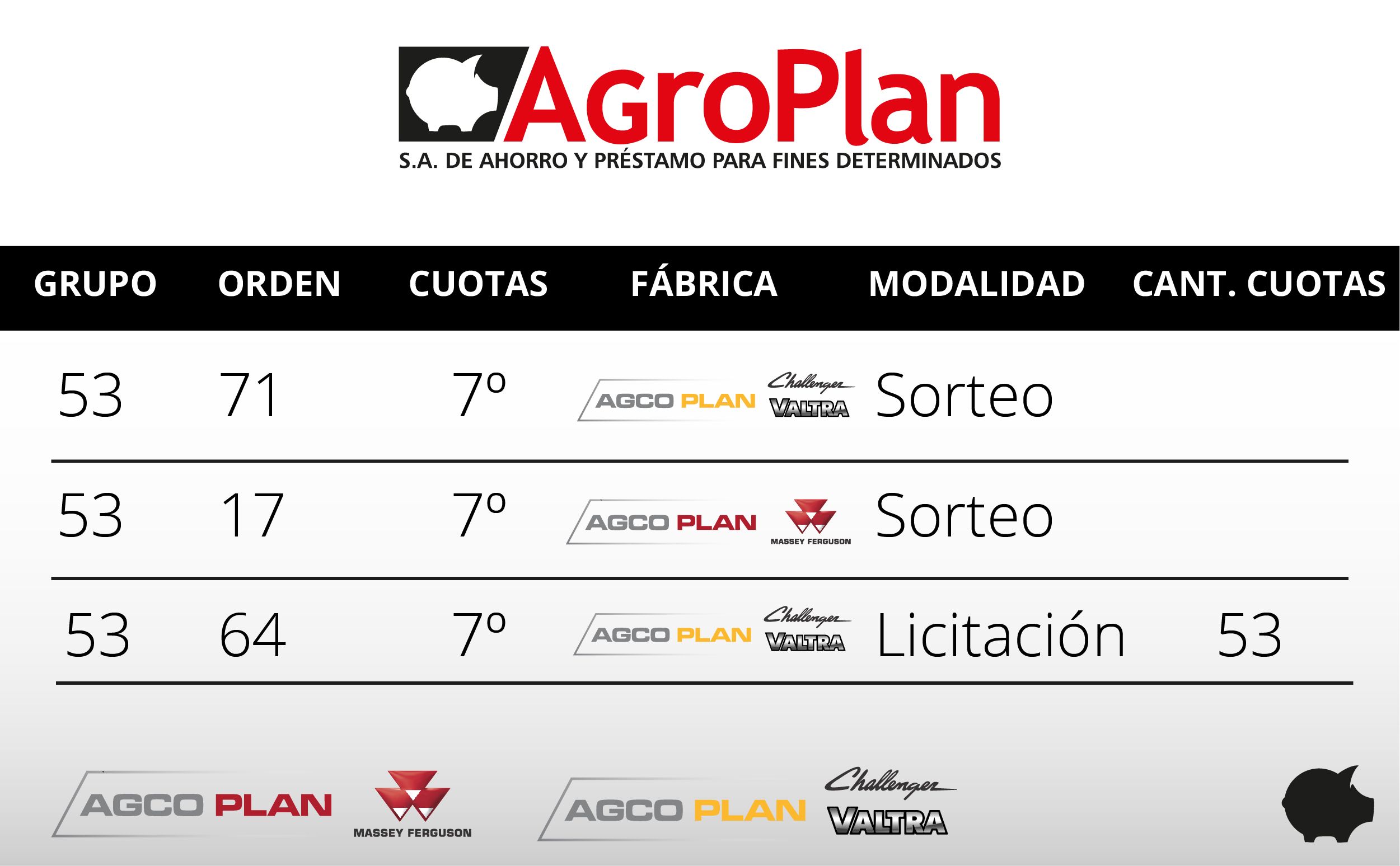 En el dia de ayer se realizo el 7° Acto de Adjudicación de AGCO PLAN, correspondiente al mes de Enero donde resultaron beneficiados por la modalidad Sorteo en el Grupo 53 orden 71 del concesionario Zuqueli Hnos S.R.L y Orden 17 del concesionario Rio Tercero Agroruta 6 S.A.
