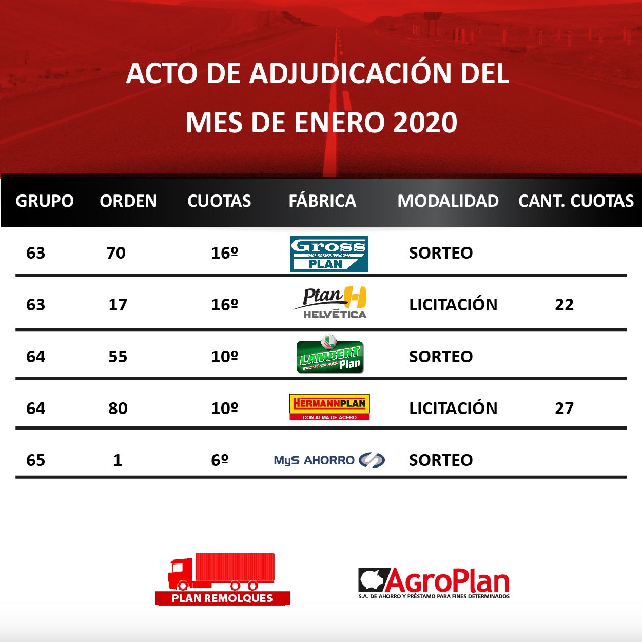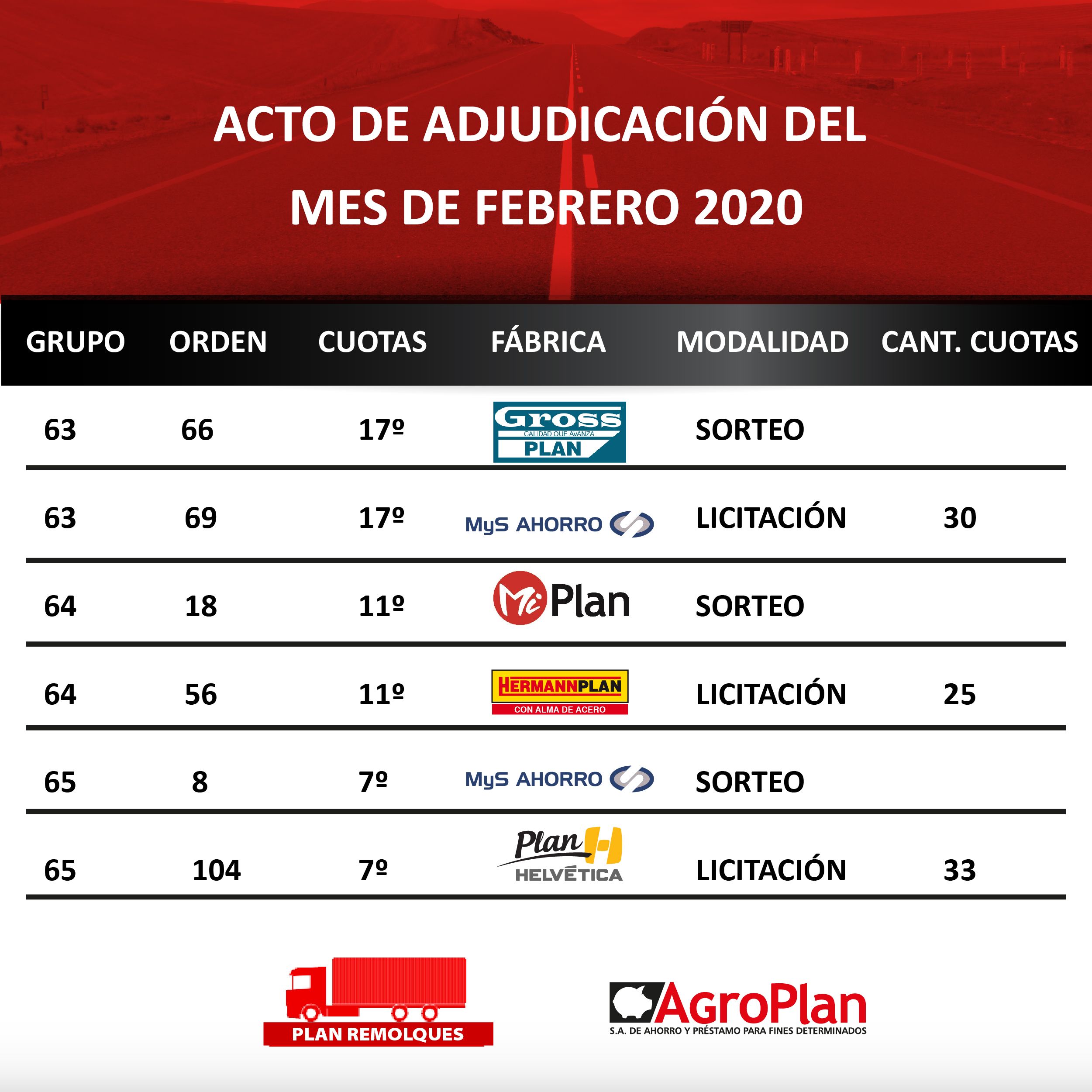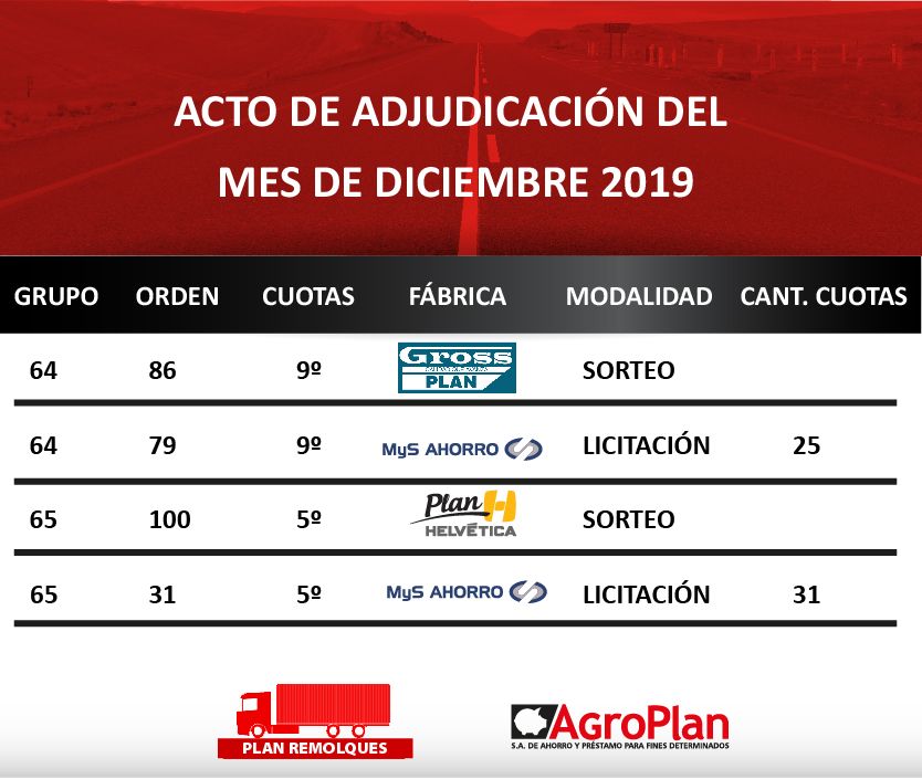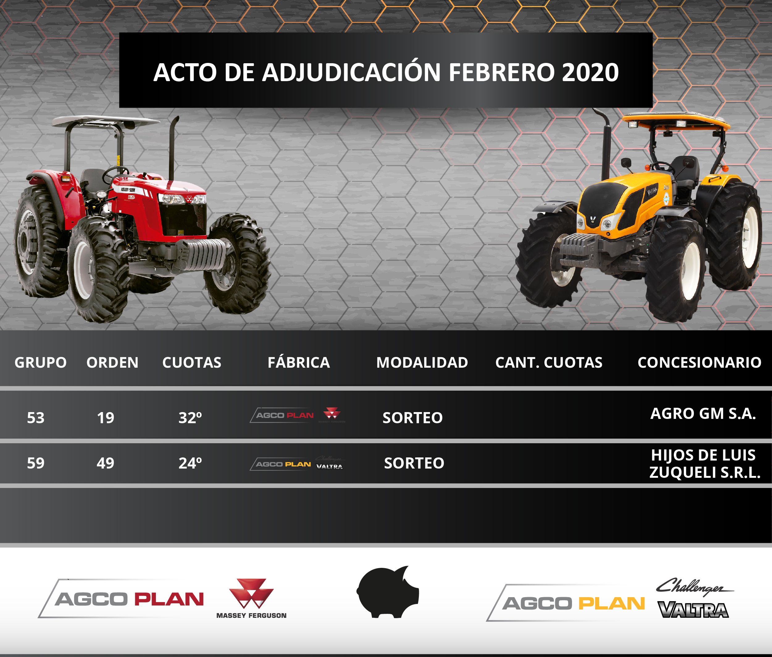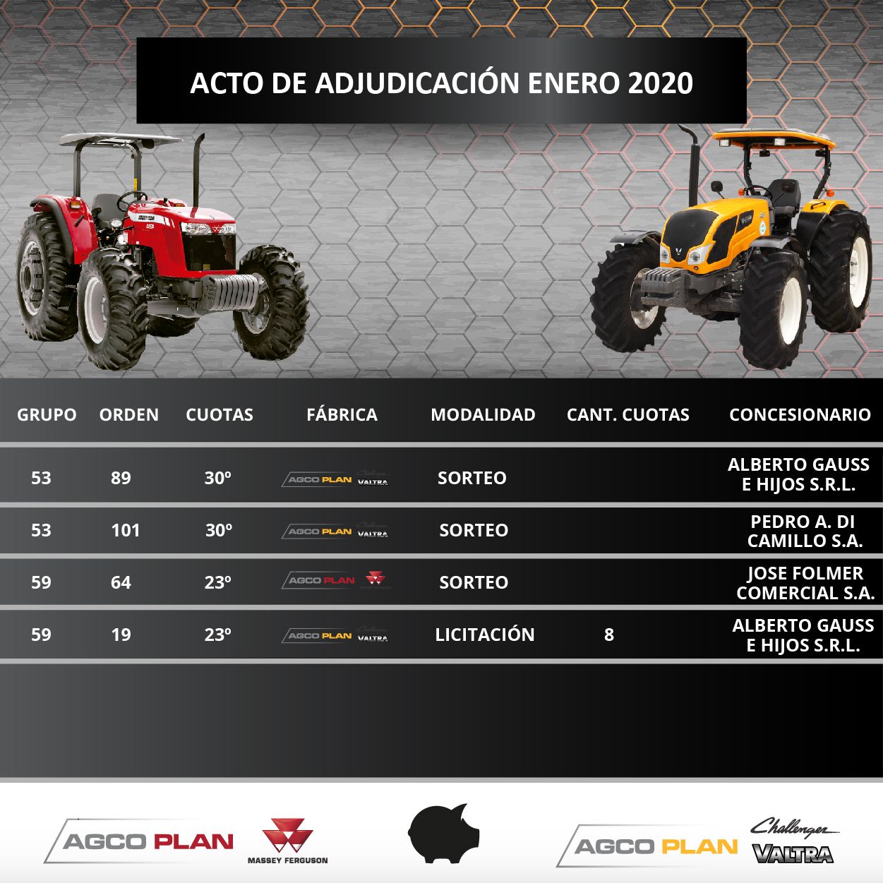 El pasado Viernes 31 de Enero, se realizo el Acto de Adjudicación para el grupo 53 y 59 de AGCO PLAN, en nuestras oficinas en la ciudad de Paraná ante la presencia de escribano público, donde salieron adjudicadas 4 unidades. ¡¡Felicitaciones!!
