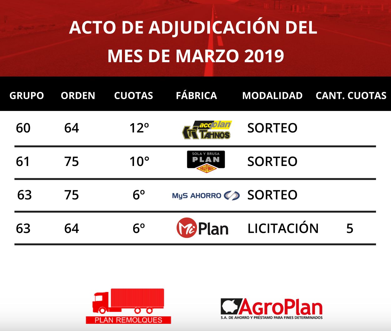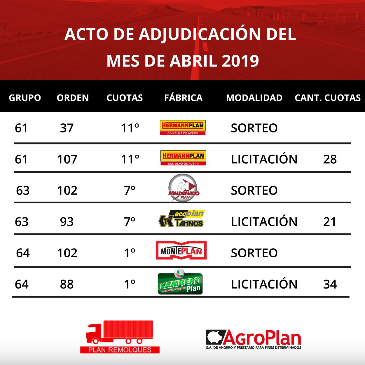 🚛🎉 El día de hoy se realizo en nuestras oficinas de la ciudad de Paraná el acto de adjudicación correspondiente al mes de Abril 2019, donde salieron adjudicadas 28 unidades de Remolques.