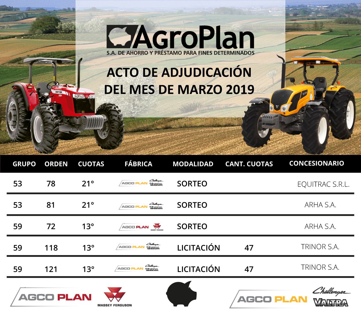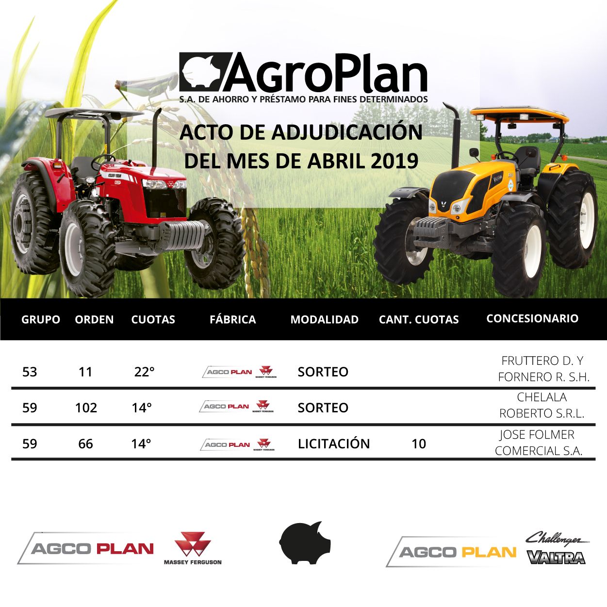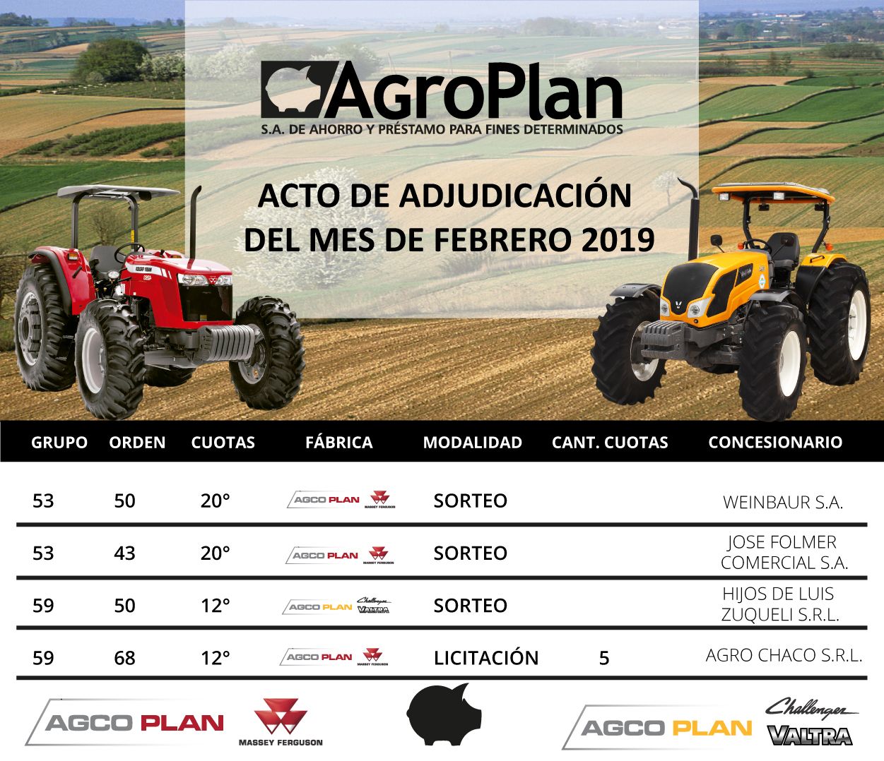 🚜🎉 En el día de hoy se realizo el Acto de Adjudicación para el grupo 53 y 59 de AGCO PLAN, correspondiente al mes de Febrero 2019, en nuestras oficinas en la ciudad de Paraná ante la presencia de escribano público, donde salieron adjudicadas 4 unidades.