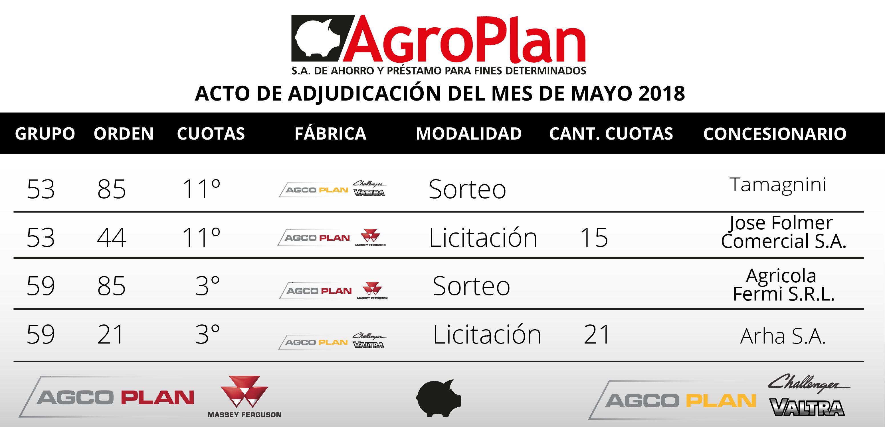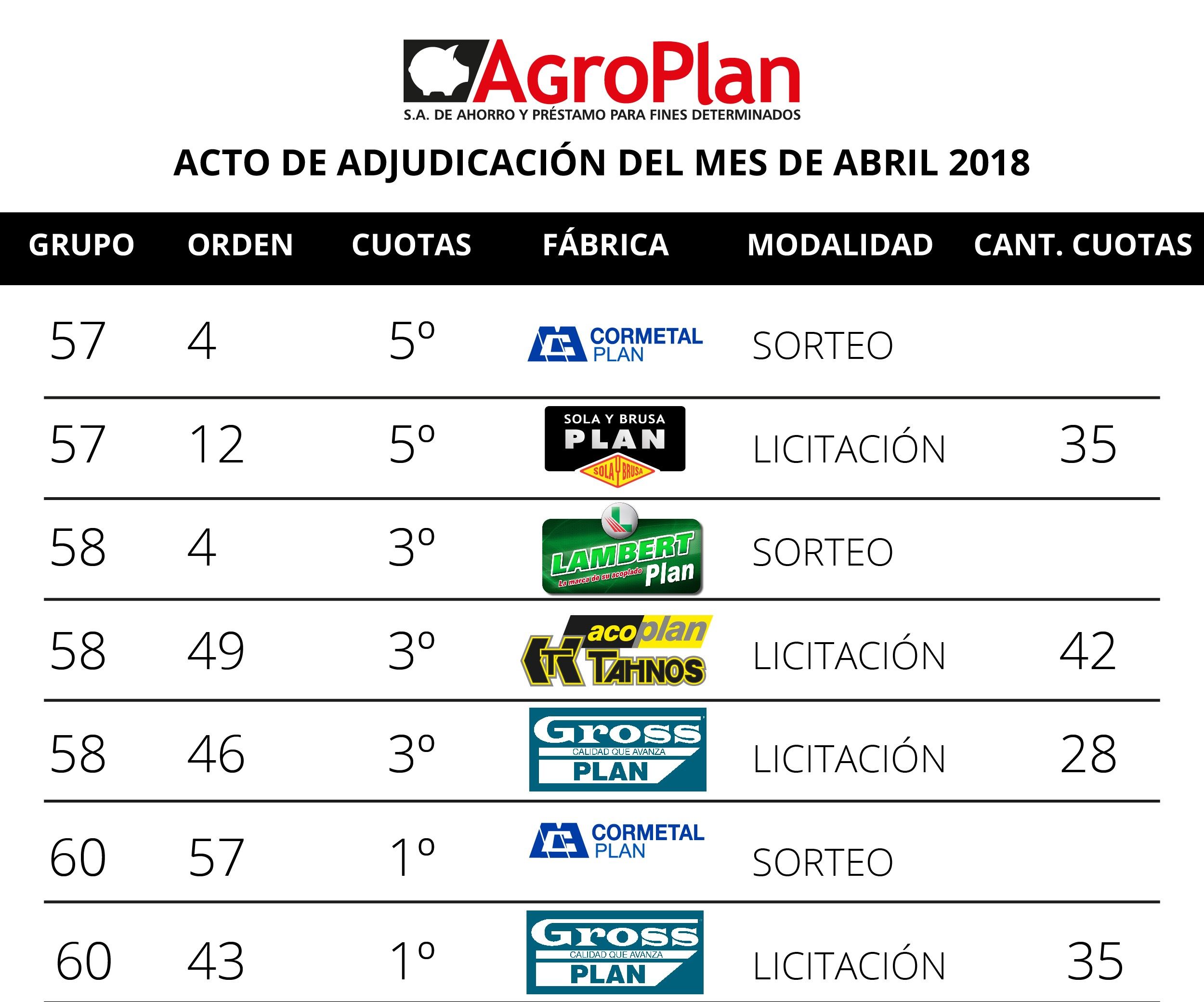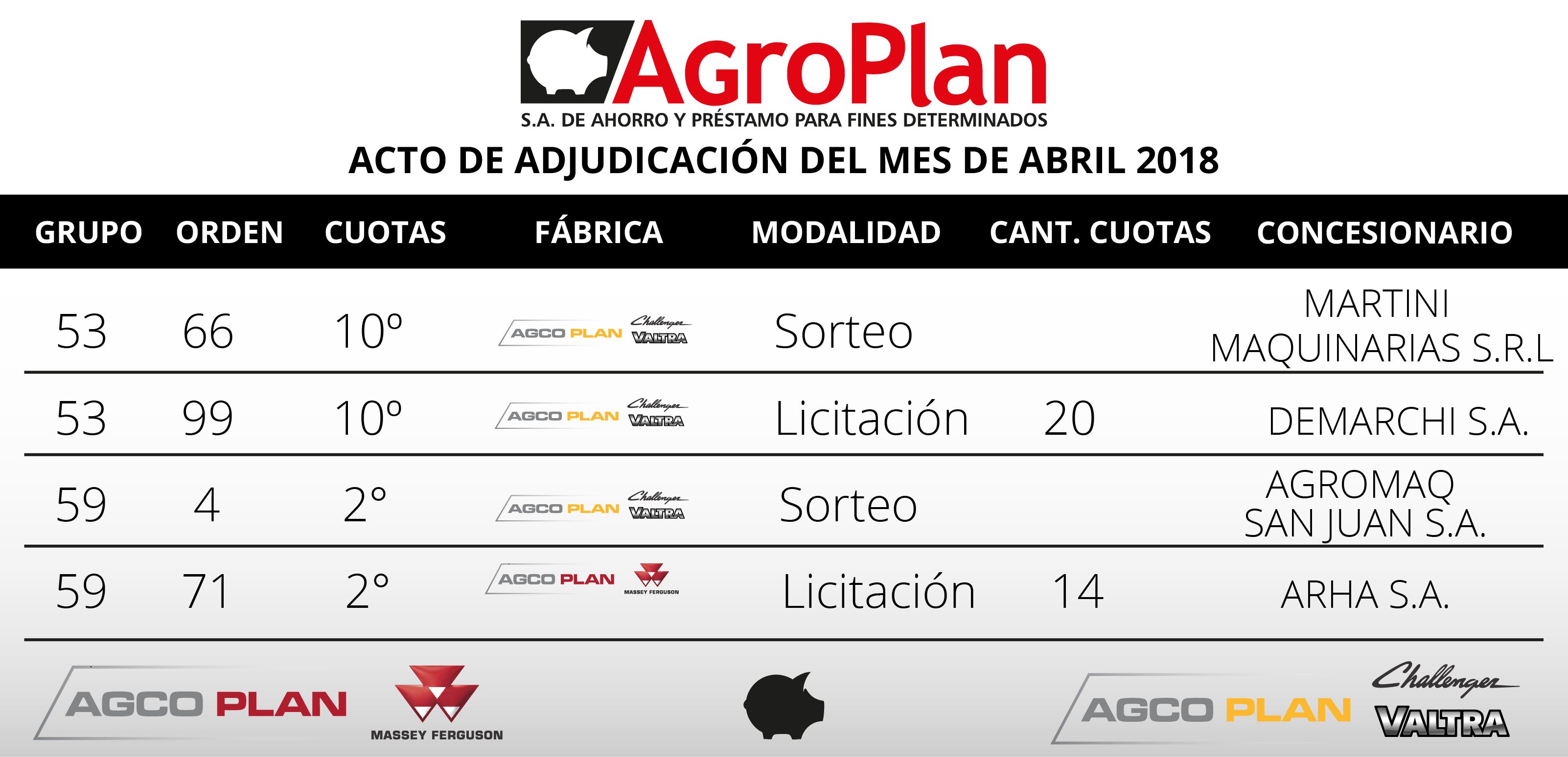 En el dia de hoy se realizo el 10° Acto de Adjudicación para el grupo 53 y el 2° para el grupo 59 de AGCO PLAN, correspondiente al mes de abril 2018.